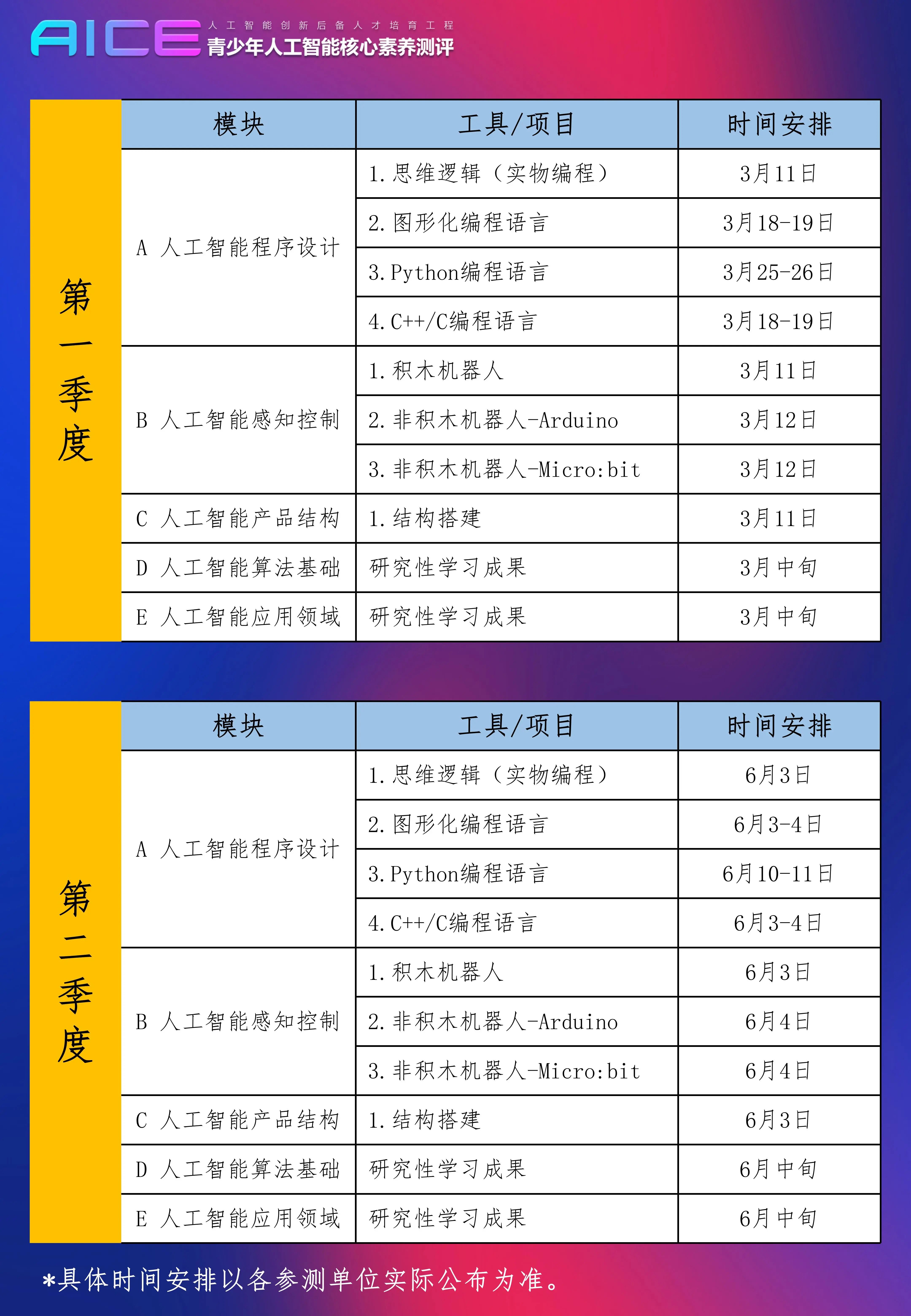 (根据全国不同地区和不同合作单位的具体情况不同,测评项目具体各级别的详细时间安排以各运营中心和各组织单位通知为准。)