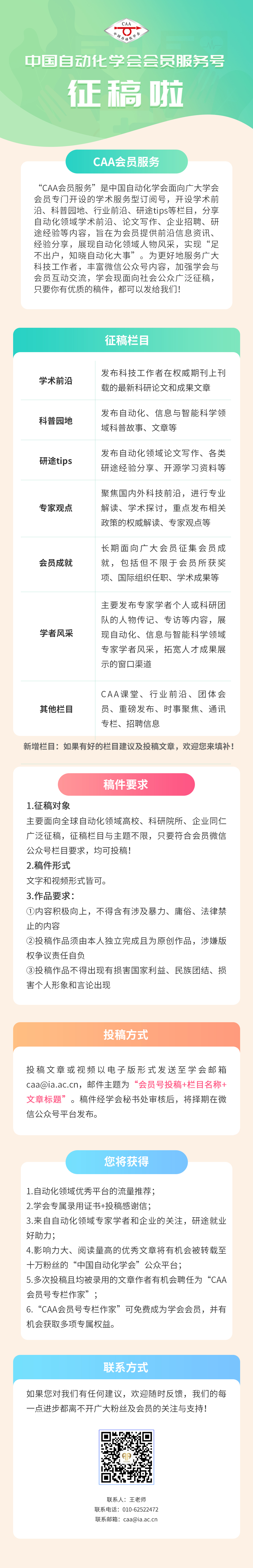 “CAA会员服务”是中国自动化学会面向广大学会会员专门开设的学术服务型订阅号,开设学术前沿、科普园地、行业前沿、研途tips等栏目,分享自动化领域学术前沿、论文写作、企业招聘、研途经验等内容,旨在为会员提供前沿信息资讯、经验分享,展现自动化领域人物风采,实现“足不出户,知晓自动化大事”。