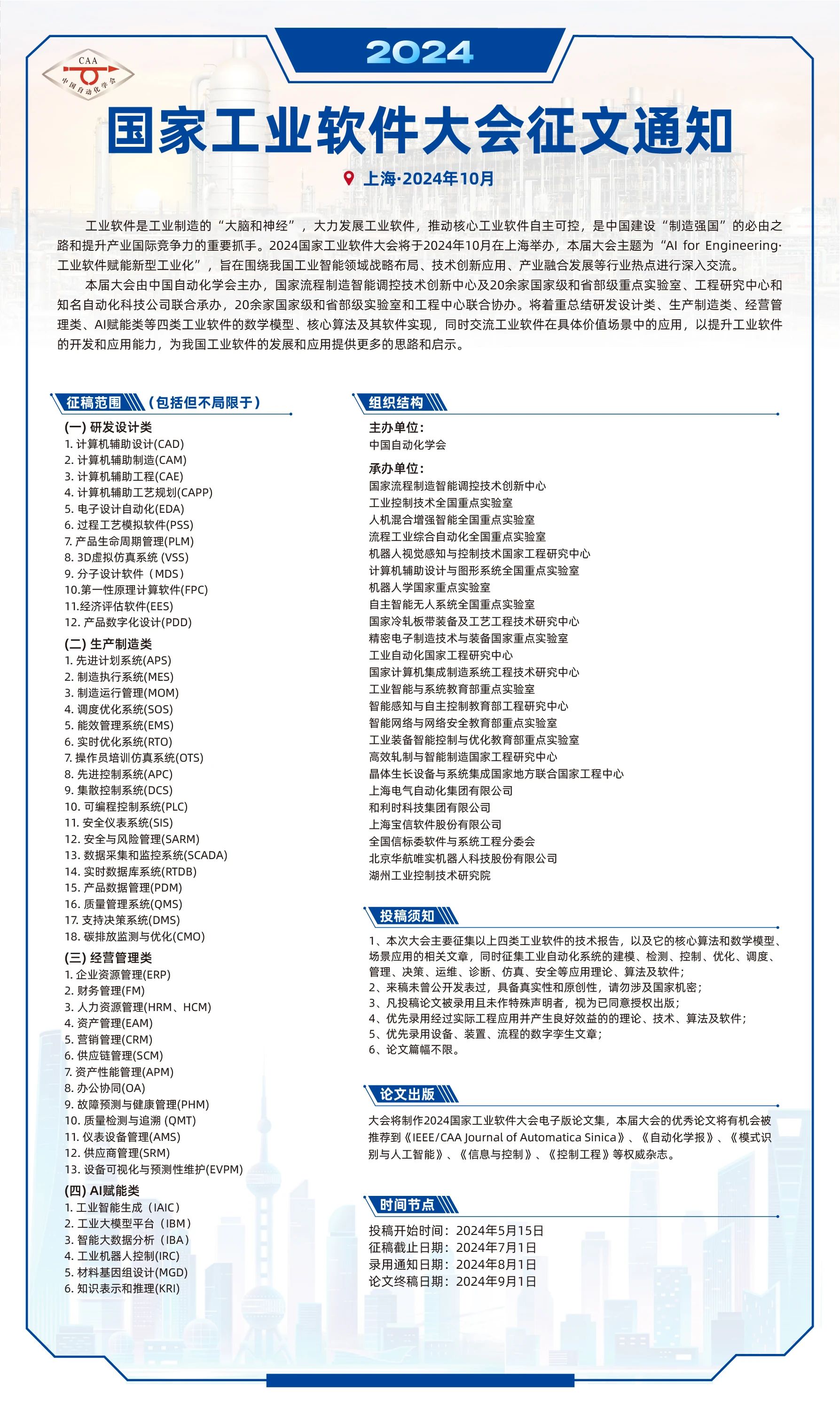 1、本次大会主要征集以上四类工业软件的技术报告,以及它的核心算法和数学模型、场景应用的相关文章,同时征集工业自动化系统的建模、检测、控制、优化、调度、管理、决策,运维,诊断、仿真,安全等应用理论、算法及软件;
