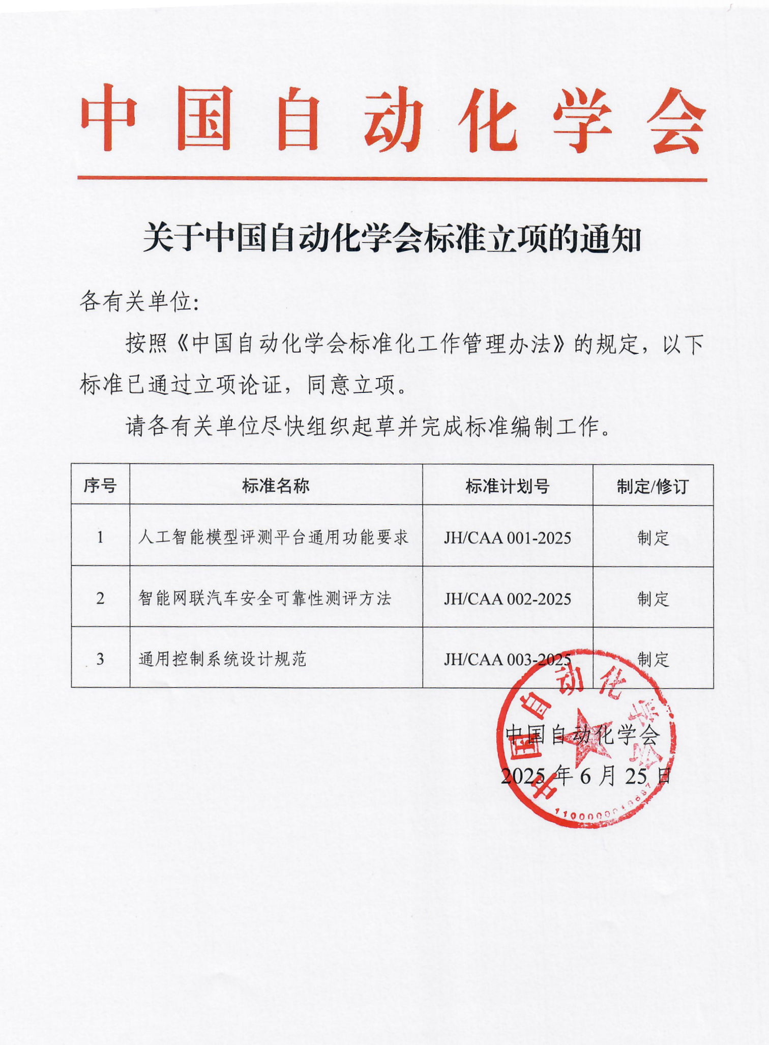 按照《中国自动化学会标准化工作管理办法》的规定,以下标准已通过立项论证,同意立项。