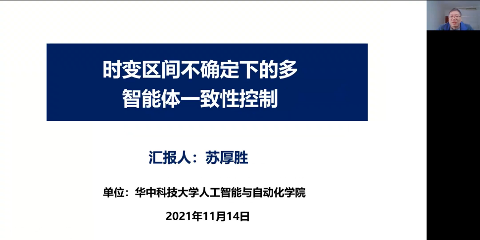 第五位报告人为来自华中科技大学的苏厚胜教授,报告题目为“时变区间不确定下的多智能体一致性控制”。报告中通过对输出反馈方法的描述,以正系统理论为主要依据,讨论了具有时变区间不确定性和初始状态未知的连续时间不确定多智能体系统的一致性问题。