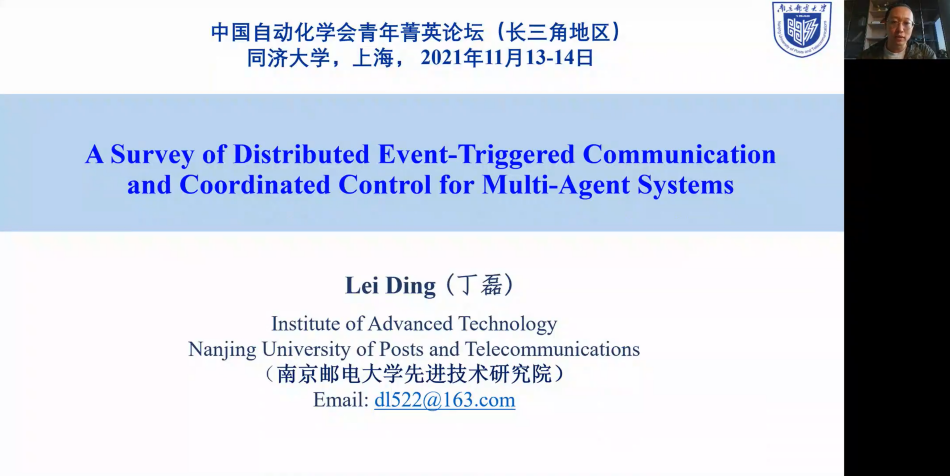 第五位报告人为来自南京邮电大学的丁磊教授,报告题目为“A survey of distributed event-triggered communication and coordinated control for multi-agent systems”。报告针对多智能体系统的分布式事件触发通信与协同控制的研究现状进行了综述,介绍多智能体系统协同控制的背景和事件触发机制的基本框架,回顾了文献中已有代表性的研究成果和方法,讨论了多智能体系统的分布式事件触发通信和协同控制的几个具有挑战性的研究问题。