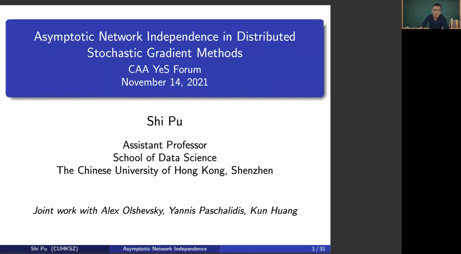 第八位报告人为香港中文大学(深圳)的濮实助理教授,报告题目为“Asymptotic network independence in distributed stochastic gradient methods”。报告对分布式随机梯度下降算法与集中式梯度下降算法的性能进行了比较,并讨论了分布式随机梯度算法实现网络化收敛速度的瞬态时间。