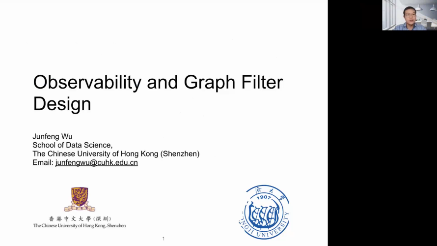 第十位报告人为来自香港中文大学(深圳)的吴均峰副教授,报告题目为“Observability and graph filter design”。报告中研究了有限脉冲响应(FIR)图滤波器的完全分布设计问题,通过向节点引入可观察图频率的概念证明了节点的输出信号(观察信号)仅包含其所谓可观察图频率的频谱成分,并从控制理论的角度揭示了节点对地磁光谱分量的可观测性与其可观测矩阵的秩相关。