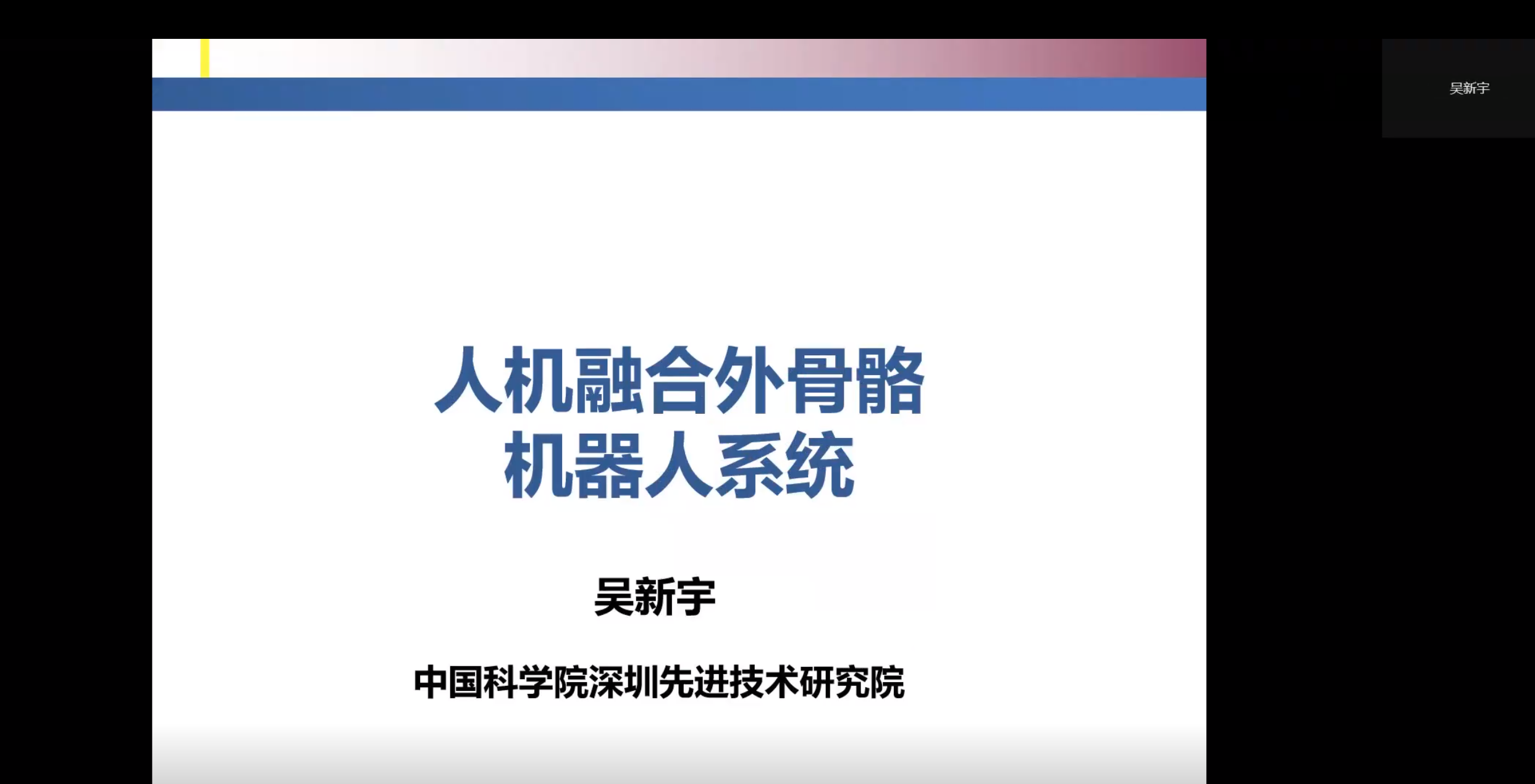 第七位报告人为来自中国科学院深圳先进技术研究院的吴新宇研究员,报告题目为“人机融合外骨骼机器人”。报告中,吴新宇研究员主要介绍了四个方面的内容:(1)基于脑机接口的穿戴者运动意图识别方法—提高人-机认知交互的信息传递效率;(2)复杂行走环境下的多模感知与步态模式规划模型;(3)下肢外骨骼机器人自主决策机制—提高机器人系统的自适应能力;(4)以人为本的人-外骨骼-环境融合决策机制。重点介绍了如何提高人机智能融合系统在复杂环境中的适应性,拓展外骨骼机器人的应用场景。