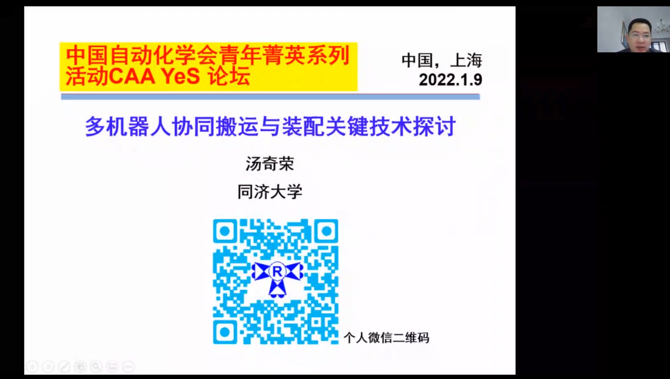 第十四位报告人为来自同济大学的汤奇荣教授,报告题目为“多机器人协同搬运与装配关键技术研究”。报告中,汤奇荣教授主要围绕多机器人的协同搬运、装配、大规模异构机器人集群扩展障碍突破,以及在面向复杂使役环境时的协同操作与技巧学习,从运动学、动力学建模出发,到与目前机器训练类方法的对比,再到多(群)机器人基于局部动力学伺服的集群控制、非直接通信、和群平台创制和应用等。