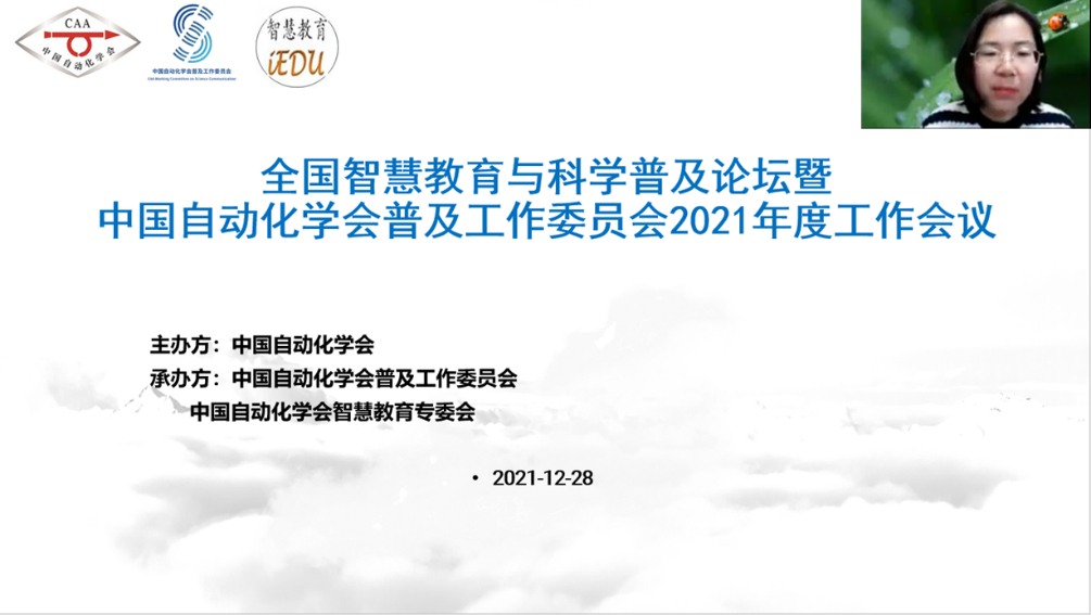 自动化学会张楠秘书长在致辞发言中回顾了普及工作委员会、智慧教育专委会2021年的工作成绩。她谈到,今年恰逢中国共产党成立100周年,同时也是中国自动化学会成立60周年,普及工作委员会和智慧教育专委会共同努力,联合开展了一系列行之有效的工作,推动了人工智能技术与教育深度融合,进一步推进了高水平人工智能师资队伍建设;推广普及人工智能教育,助力人工智能时代创新型人才培养,提高了中国自动化学会整体的科学传播能力。她对全体委员的出色工作、辛苦付出表示感谢,对科普工作委员会对学会做出的贡献表示感谢,今年中国自动化学会荣获民政部授予的“全国先进社会组织”荣誉称号,全国两百余家学会只有9家获此殊荣,这里也包含了普及工作委员会的成绩,对此表示热烈的祝贺和感谢。