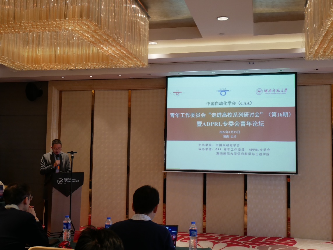 2022年1月15日,中国自动化学会(CAA)青年工作委员会“走进高校系列讨论会”(第16期)暨CAA自适应动态规划与强化学习(ADPRL)专委会青年论坛活动在长沙佳兴世尊酒店隆重举行。本次会议联合湖南省自动化学会年会共同召开,为人工智能与自动化领域专业人员带来了一场学术盛宴。会议由中国自动化学会主办,CAA 青年工作委员会、CAA自适应动态规划与强化学习专委会和湖南师范大学信息科学与工程学院共同承办。