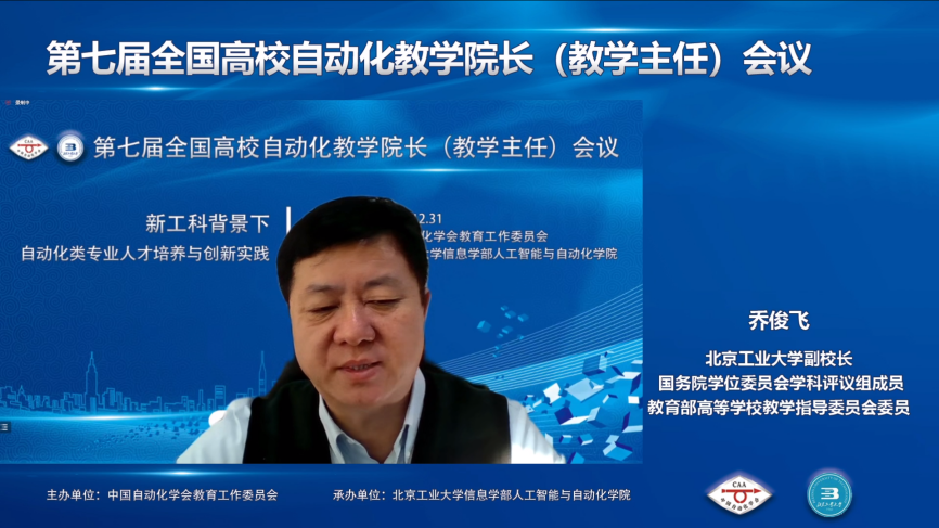 张涛主任首先致开幕辞,感谢全体参会代表对本次会议的大力支持,表示本次会议将总结交流自动化专业建设与人才培养经验,面向“十四五”构建自动化领域高等教育高质量发展体系,提升自动化专业人才培养水平,促进自动化专业与控制科学与工程学科的高质量发展,进一步密切全国高校自动化专业的联系。乔俊飞副校长致欢迎辞,本次会议受新冠疫情影响几经周折后终于隆重召开,非常感谢中国自动化学会教育工作委员会对北京工业大学组织承办此次会议的支持,同时对与会专家的到来表示最热烈的欢迎和诚挚的感谢,相信通过本次会议的交流研讨将有助于促进全国高校自动化专业建设、展示我国高校自动化教育研究和实践的优秀成果、对高校自动化专业人才培养和创新实践产生深远的影响,也诚挚邀请各位专家委员经常莅临北工大指导。