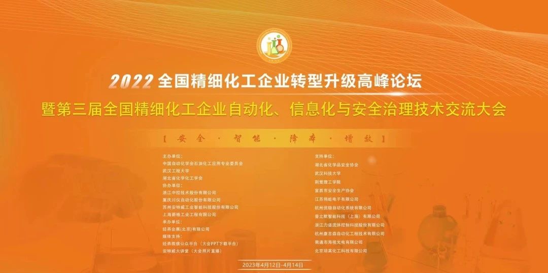 2023年4月12日-4月14日,“2022全国精细化工企业转型升级高峰论坛暨第三届全国精细化工企业自动化、信息化与安全治理技术交流大会”在武汉顺利召开,会议由中国自动化学会石油化工应用专业委员会、武汉工程大学、湖北省化学化工学会等单位联合举办,浙江中控、重庆川仪、苏州安特威、上海爵格共同协办了此次大会,中国自动化学会石油化工应用专业委员会秘书长张建立主持了开幕式。