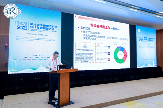 刘成林主任总结了专委会在过去一年中的工作情况:共同组织了中国模式识别与计算机视觉大会,为专业领域的学者提供了一个重要的交流平台;共举办了4期模式识别前沿论坛,邀请了各个领域的专家学者进行报告,促进了前沿科研的交流与合作;结合最新研究趋势,举办了多模态人工智能前沿技术讲习班,为研究人员提供了学习和研究的机会;定期发布专委会通讯,2023年已出版3期简报,及时传达了专委会工作和行业新进展;持续使用微信公众号进行宣传,共发表信息191条,阅读量超27万次;完成了5期专家访谈,并在专委通讯发布,提高了专委会的知名度和影响力;举办4次专委会科普活动,让更多的普通大众和中小学生了解人工智能和模式识别,为普及科学知识和促进科学普及做出了积极贡献。