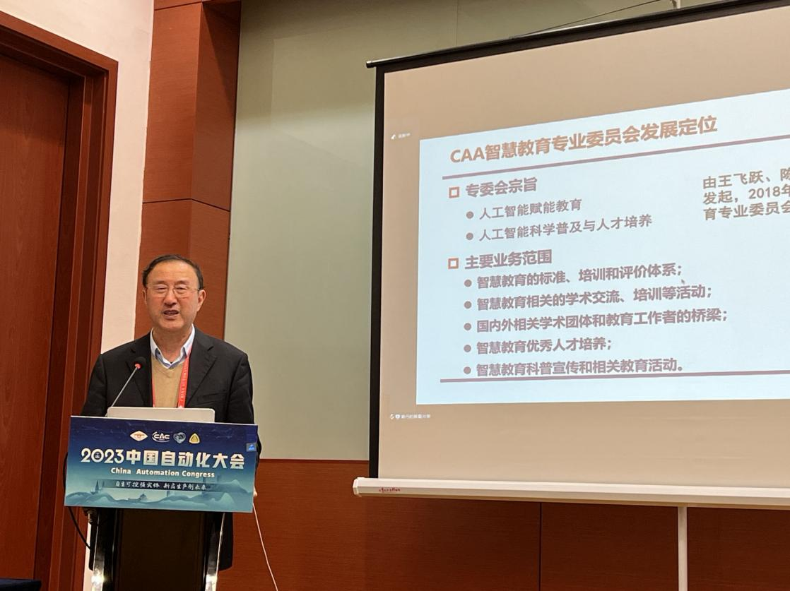 随后,中国自动化学会理事、第一届智慧教育专业委员会主任委员、浙江工业大学王万良教授作第一届智慧教育专业委员会工作总结报告。他表示,智慧教育专业委员会是为促进人工智能技术与教育科学的深入融合以及人工智能科学普及而设立的。专委会自2018年成立以来,积极搭建交流平台,为专家委员提供展示机会。自成立以来,第一届智慧教育专委会每年组织召开2-3次学术活动,参与中国自动化大会组织智慧教育专题论坛;每年申报中国科学技术协会智慧教育相关项目2-3项;发起举办、承办、协办和指导多个面向大中小学生的科技类赛事;发起青少年人工智能创新后备人才培育工程、人工智能探究性学习训练营,发布和支持一系列教科研课题,有力支持人工智能后备人才的发现与培养。第一届专委会按照学会要求积极参加学会工作,取得了一定的成绩,圆满完成第一届任期。最后,他表示感谢学会一直以来的支持指导并期待继续为专委会发展创新提供支持。