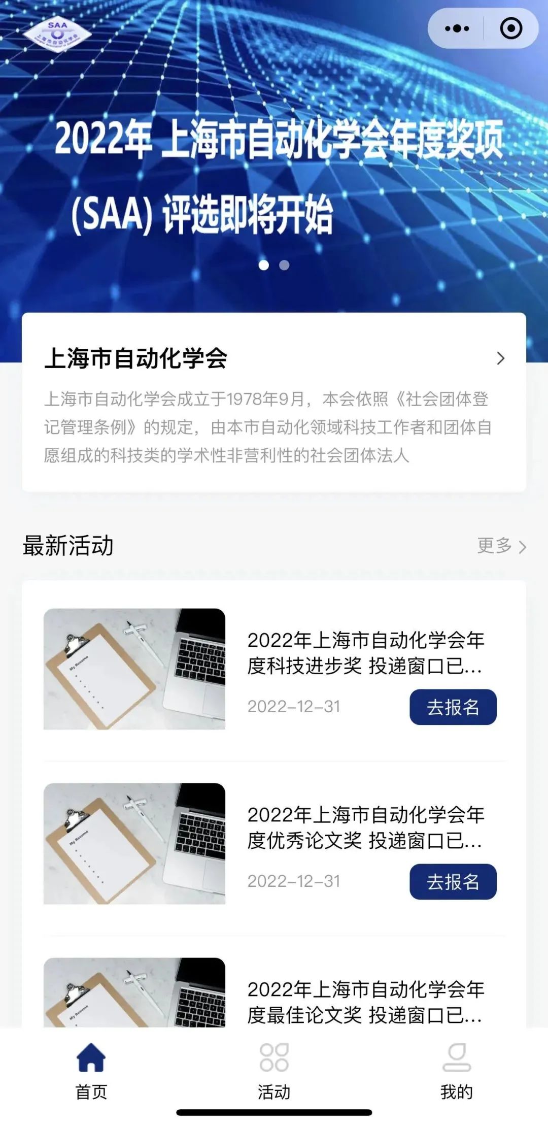 2022年度学会小程序正式发布,电子会员管理系统正式上线,完成会员注册、提交材料、活动报名等事务的无纸化进程。