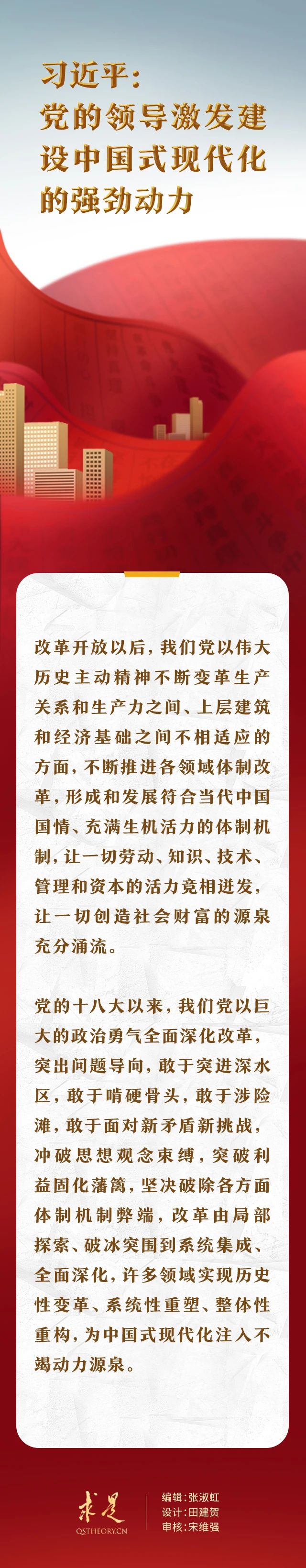 “改革开放是决定当代中国命运的关键一招,也是决定中国式现代化成败的关键一招。”在2023年第11期《求是》杂志刊发的习近平总书记重要文章《中国式现代化是中国共产党领导的社会主义现代化》中,总书记用改革开放40多年来的成就和经验,深刻阐明“党的领导激发建设中国式现代化的强劲动力”。