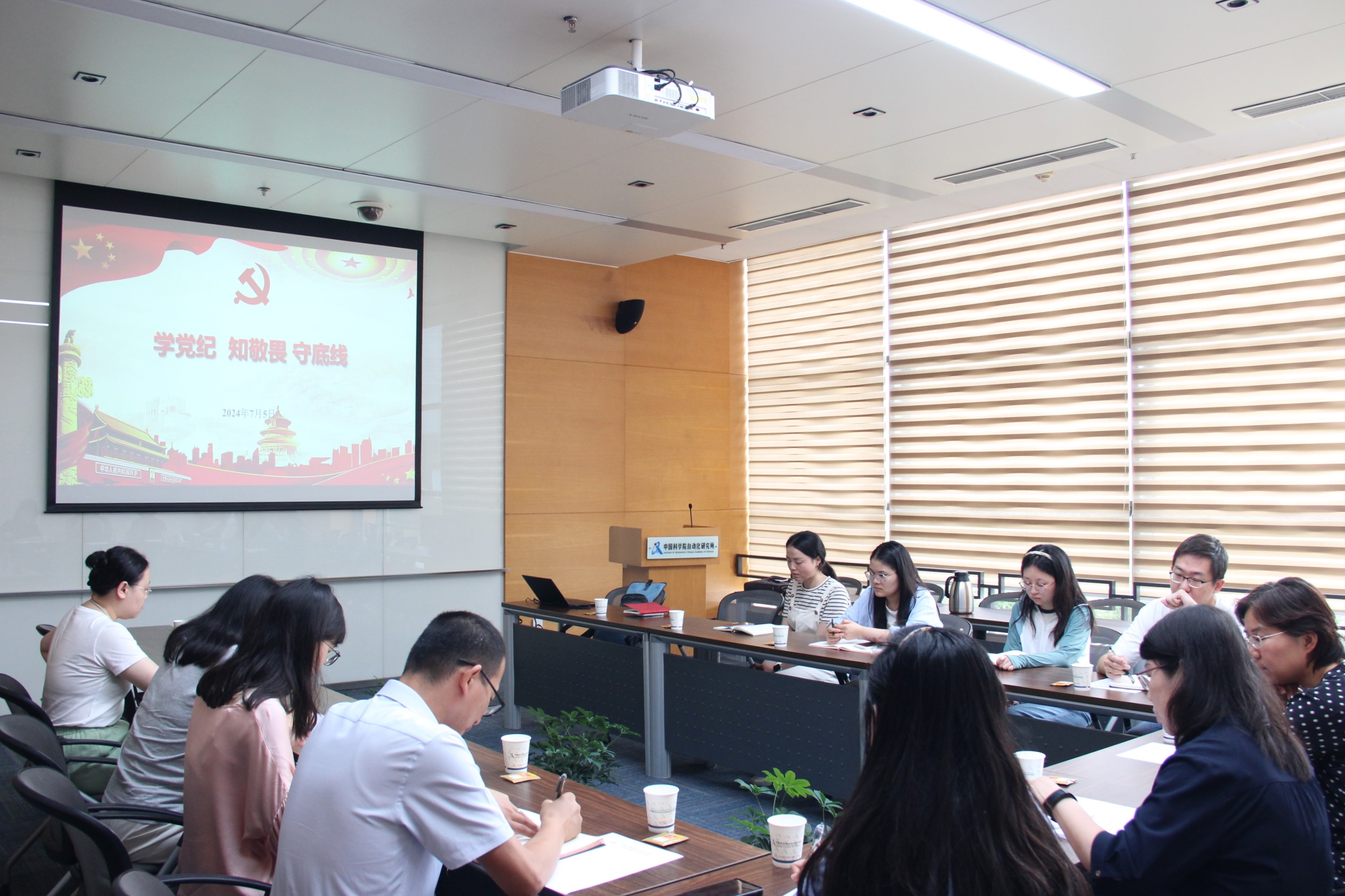 为热烈庆祝中国共产党成立103周年,深入学习贯彻习近平总书记关于党纪学习教育的重要讲话和重要指示精神,推动党纪学习教育走深走实,2024年7月5日,中国自动化学会办事机构党支部召开专题党课活动,邀请中国科学院自动化研究所党委委员宋琪讲授以“学党纪 知敬畏 守底线”为主题的专题党课,学会办事机构全体党员和积极分子参会学习。活动由中国自动化学会秘书长、办事机构党支部书记张楠主持。