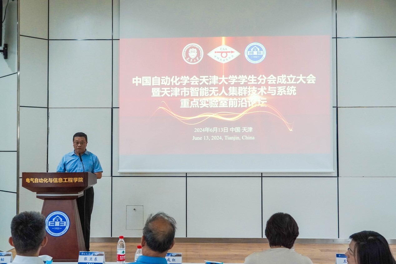 2024年6月13日上午,中国自动化学会天津大学学生分会暨天津市智能无人集群技术与系统重点实验室前沿论坛在天津大学卫津路校区SEIE报告厅顺利举行。本次会议由中国自动化学会主办,天津大学电气自动化与信息工程学院承办。中国自动化学会会士、副理事长王成红研究员,中国自动化学会秘书长张楠,中国自动化学会副秘书长王坛,天津大学电气自动化与信息工程学院院长谭超教授出席本次会议。出席会议的还有天津大学电气自动化与信息工程学院的教师和学生代表。会议由天津大学自动化系主任胡超芳教授主持。