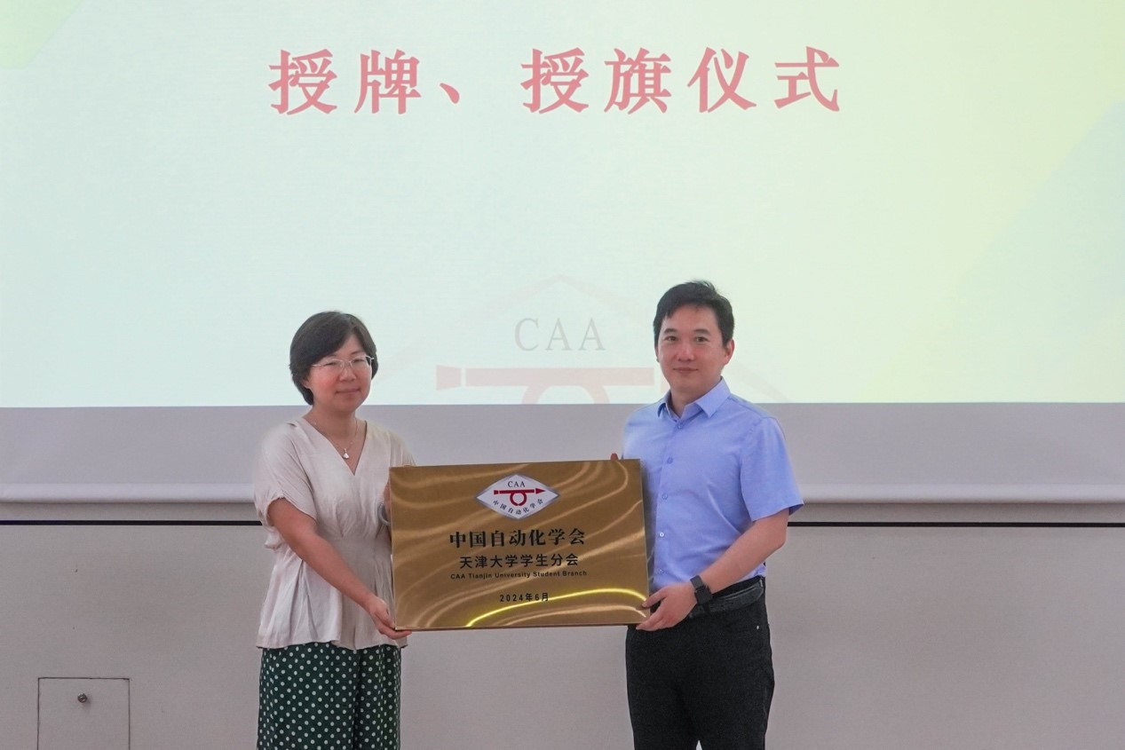 随后,中国自动化学会秘书长张楠向天津大学电气自动化与信息工程学院院长谭超教授授予会牌、会旗,并为中国自动化学会天津大学学生分会首届指导委员会与执行委员会成员颁发聘书。