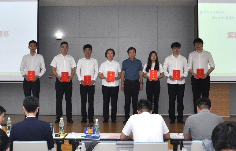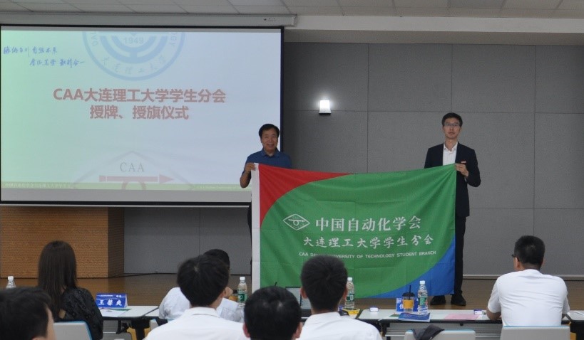 随后,侯增广副理事长和吴玉虎院长进行授牌、授旗仪式,侯增广副理事长为中国自动化学会大连理工大学学生分会指导委员会与执行委员会成员颁发聘书。
