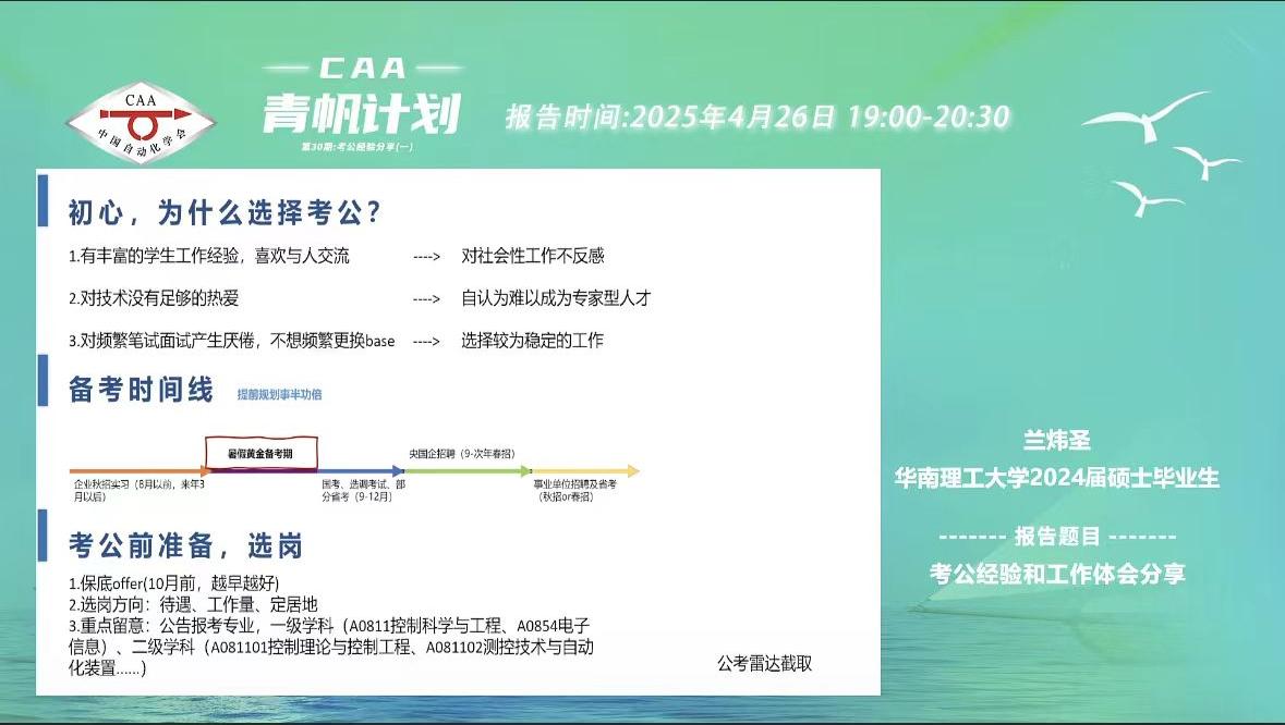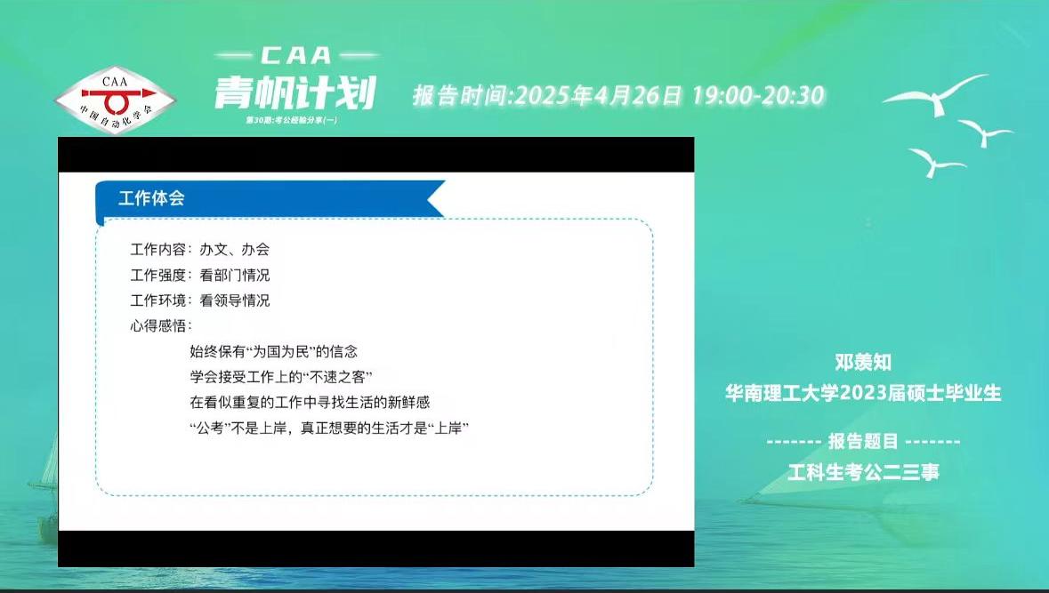 4月26日晚上19:00,由中国自动化学会主办,CAA华南理工大学学生分会和CAA中南大学学生分会联合承办的CAA青帆计划第30期“考公经验分享·第一期”在线上成功举办。本次活动吸引了众多CAA学生会员的积极参与,旨在通过分享嘉宾的宝贵经验,为有意向报考公务员的学生提供全面、实用的指导。