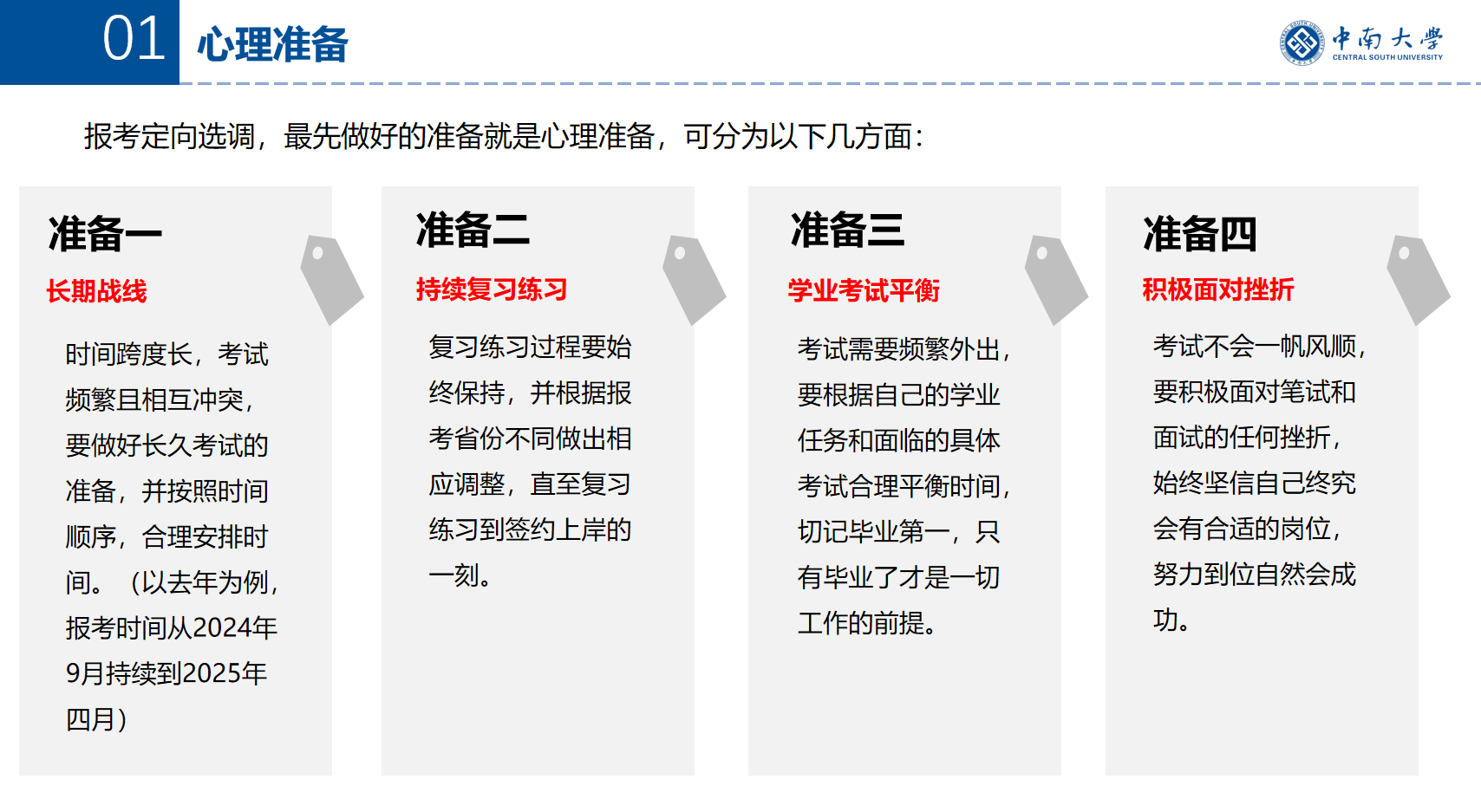 首先,于千皓同学以“定向选调经验分享”为主题,详细阐述了报考定向选调的心理准备、信息收集以及针对不同省市的调整策略。他强调了心理准备的重要性,包括时间跨度的管理、持续复习练习的坚持,以及面对挫折的积极态度。同时,他还分享了如何通过学校就业中心官网、机构公众号等多种渠道收集报考信息,以及如何利用历年真题和模拟题进行针对性练习的经验。