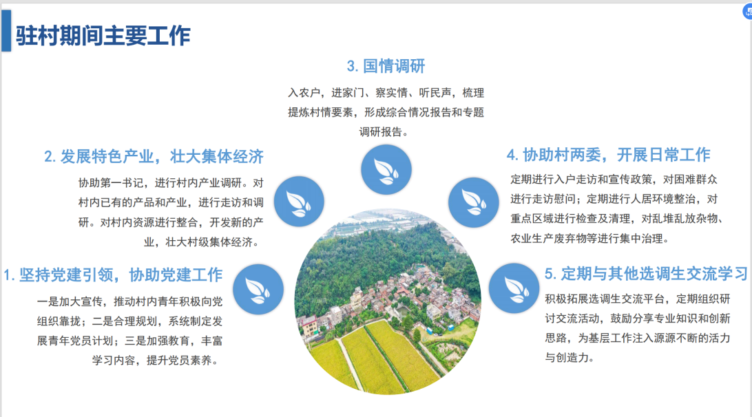 最后,兰炜圣同学以“考公经验和工作体会分享”为主题,不仅分享了自己的备考经验,还重点介绍了自己作为选调生驻村的工作经历。他详细描述了驻村期间的主要工作,包括协助村两委开展日常工作、发展特色产业、坚持党建引领等,并分享了自己在驻村期间的心得体会。