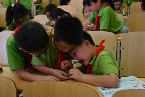 在互动环节,孩子们被分成若干小组,每组用领到的实验器材开始动手制作激光报警器。孩子们兴奋地拼装材料,互帮互助,认真观察实验现象,在志愿者同学们的指导下完成了实验。当看到自己亲手制作的实验装置成功运作时,孩子们的脸上洋溢着自豪和喜悦的笑容,较先完成器材安装和实验验证的孩子到讲台上向大家分享自己组装和实操实验的技巧方法,这极大的激发了孩子们的学习兴趣和成就感。