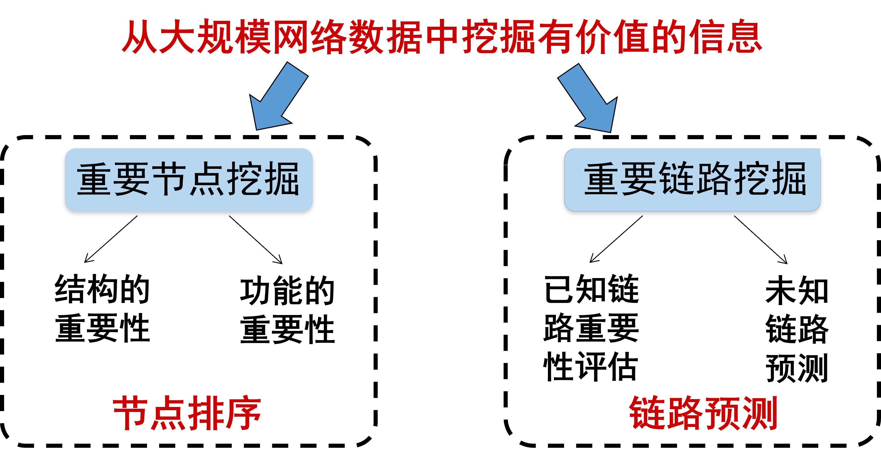 社交网络是我们日常生活中最为熟悉的网络,每个人作为社交网络中的节点,通过线上线下关系联系起来。回到刚开始的问题,为什么一条网络谣言可以引爆全网大规模舆情,我们又应该从何入手、控制舆情呢?解决这些问题的关键在于在社交平台上找到谣言传播过程中的关键人物,以及识别和切断重要的传播路径。归结起来就是对两个关键科学问题的探索:如何挖掘网络中的重要节点[3],以及如何挖掘网络中的重要链路[4]。这两个问题的研究在网络科学中被称为网络信息挖掘(如图4所示)。