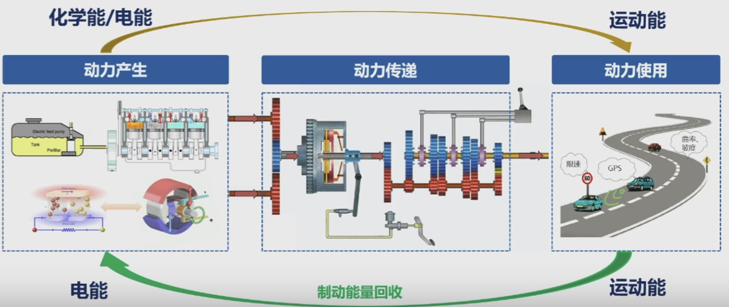 汽车驾驶的第三个特征表现在汽车系统层面。首先是以力矩为纽带的动力产生、传递、使用过程中的机-电-液-热反应动力学强耦合,如图2所示。不论是燃油车还是新能源汽车,动力系统先将化学能或电能转换为机械能,产生力矩。然后通过力矩传递和速度匹配,将动力传递至车轮,最终用于驱动车辆运动。如果系统还采用了能量回收技术,运动能将再次转换为电能,进而进一步加重了动力学耦合程度。