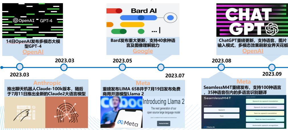 在大模型产业竞争中,企业除了技术发展之外,也十分更注重产业实际应用,国际大模型产业竞争目前呈现“激烈迅猛”之势,如图1所示。OpenAI从GPT-3.5到GPT-4的不断改进,并在多个领域的应用表现令人瞩目。