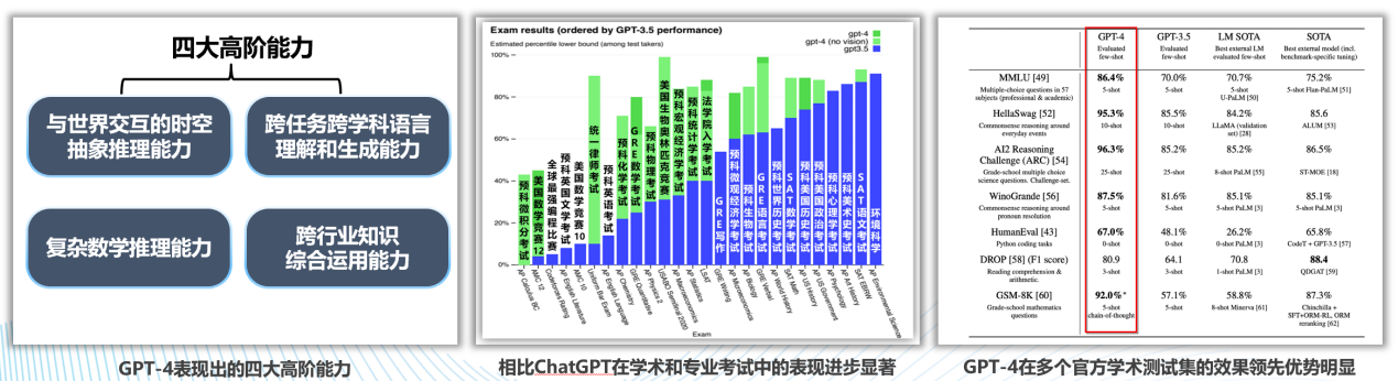 从GPT-3.5到GPT-4,其语言理解能力得到了显著提升。GPT-4进一步解决了GPT-3.5面临的长文本输入、多模态输入、外部实时知识运用等诸多挑战,在复杂认知任务(跨学科语言理解、跨行业知识运用)、复杂推理任务、多模态任务等方面继续进步,进一步抬高了智能涌现的上限,如图2所示。在此基础上,需要明确多模态和语言音处理之间的关系。语言仍然是通用人工智能的核心,它代表了人工智能在感知和理解方面的高级阶段。无论涉及图像、视频、语音,无论是理解、感知还是生成,都可以通过空间映射的方式与这一核心语言模型相结合,从而推动通用人工智能的综合发展。