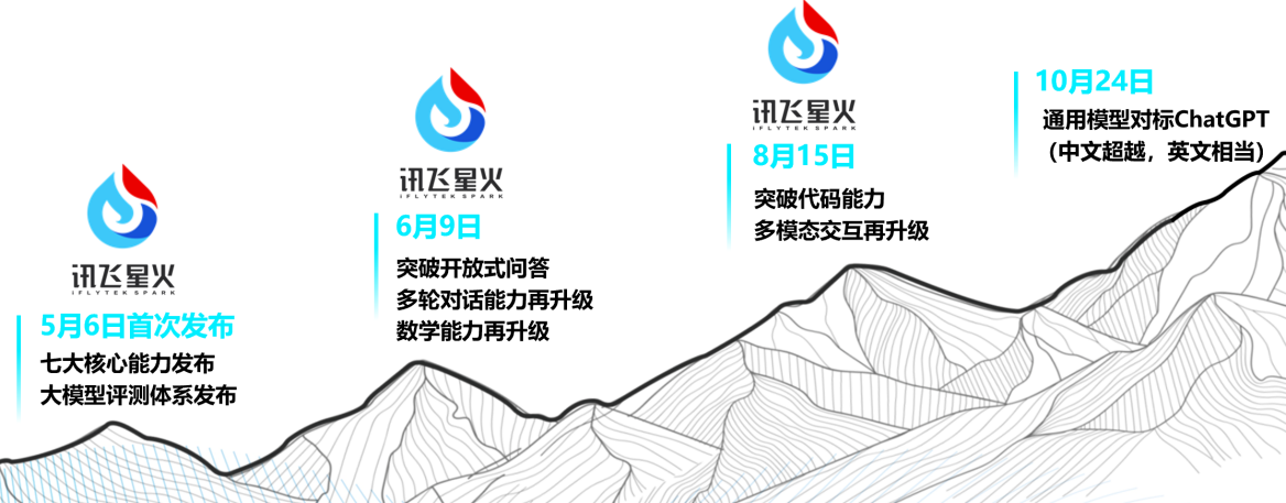 在过去的十多年中,科大讯飞在人工智能技术和各行业产业应用方面积累了丰富的经验。2022年12月15日,科大讯飞启动了大型模型攻关计划,确定了1+N的攻关策略。自2023年5月6日讯飞星火认知大模型正式发布以来,我们为大型模型制定了明确的年内升级里程碑。2023年6月9日按计划,我们实现了开放式对话突破,以及多轮对话能力与数学能力提升,并推出了星火APP,获得了广泛关注。2023年8月15日是星火大版本的更新,包括代码能力的提升、多模态能力的更新和通用能力的不断提升,发展历程如图4所示。(注:10月24日,科大讯飞再次发布讯飞星火V3.0,宣布整体超越ChatGPT)。