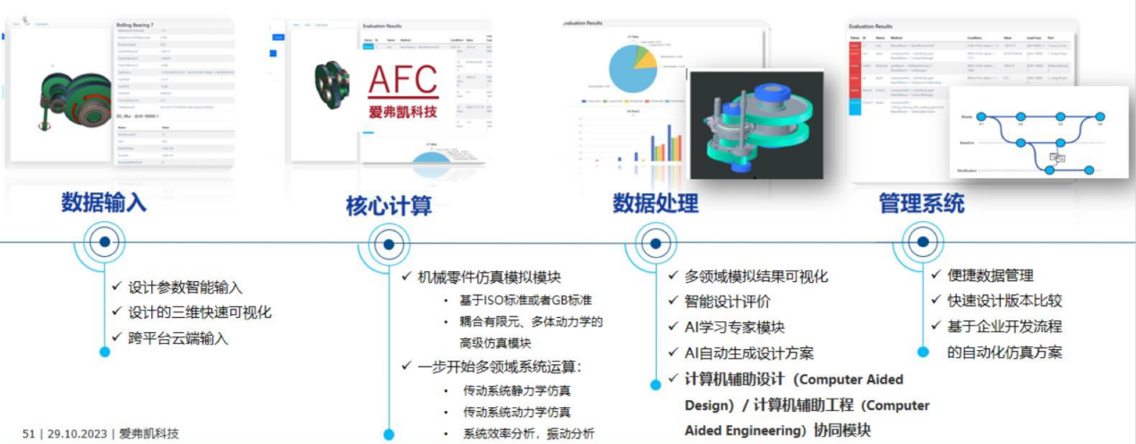 此外,爱弗凯软件还提供公有云或私有服务器的服务选项,以确保用户的信息不会被泄露。我们的计算核心采用最新的国内外模型,仿真结果与实验结果以及行业领军厂商Romax公司的结果进行对比,表明其可以满足各种使用需求,实现国产替代。我们的仿真模块包括系统动力学分析、传动轴载荷分析、轴承寿命分析、齿轮TE分析、齿轮寿命和齿面分析、效率分析等,涵盖了传动系统仿真的各个方面。这些功能使用户能够进行全面的仿真分析,确保他们的机械传动系统能够正常运行并具有良好的性能。