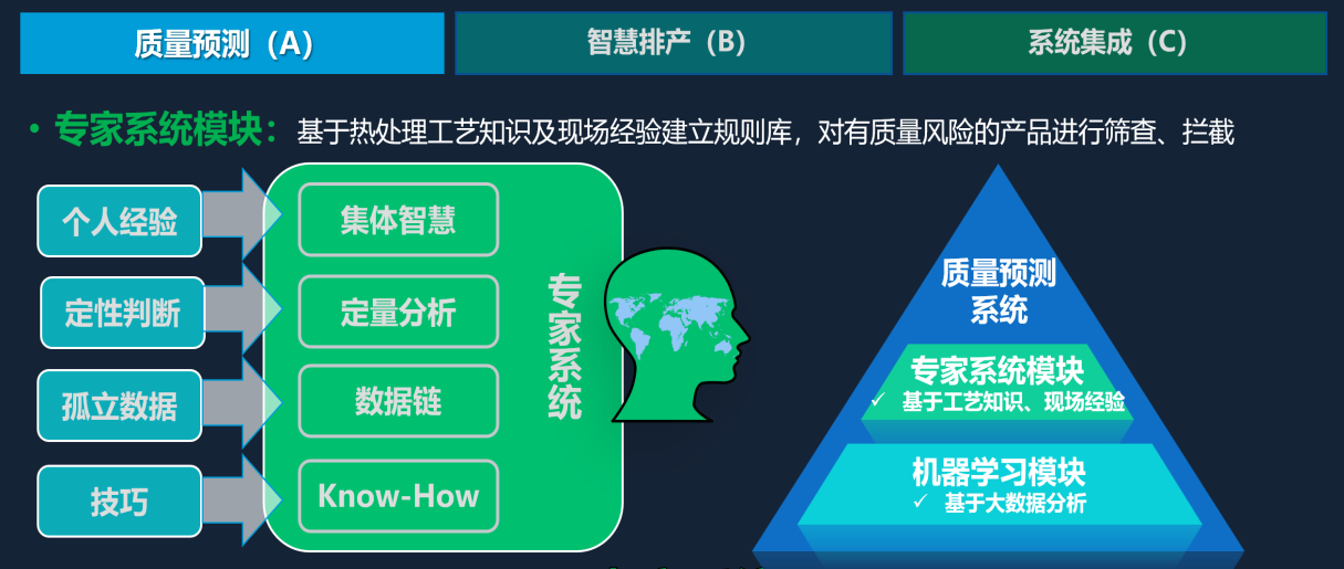 在工艺方面,尽管原来的烧炉温度有PID控制,但仍然依赖于老师傅的经验,而老师傅即将面临退休问题。为此,可以利用机器学习模块建立了一个专家库。专家库收集了专家的定量分析和经验知识,将这些重要的技巧和经验值量化并保存在专家库中,以实现对知识的传承,同时作为质量分析的基础,如图7所示。为了解决线上库存过多、资金压力过大的问题,公司进行了全面的排产优化。通过排产模型和优化算法,结合人工调整生产顺序,实现了更好地满足实际需求和优化生产的智慧排产。在这个过程中,智慧排产与质量分析、MES系统和WIP调度相结合,使整个系统更加高效,产生了显著的效益。此外,在物流方面,公司广泛采用AGV技术,实现了人力成本的降低和需求的更有效管理。