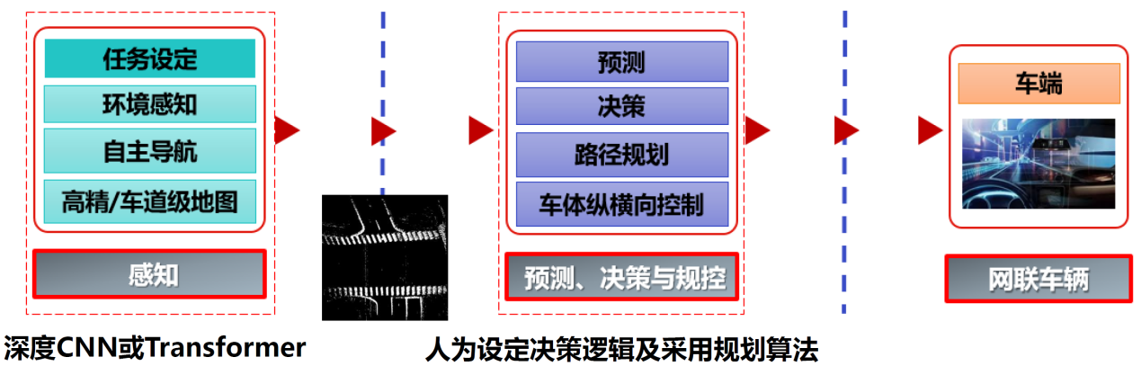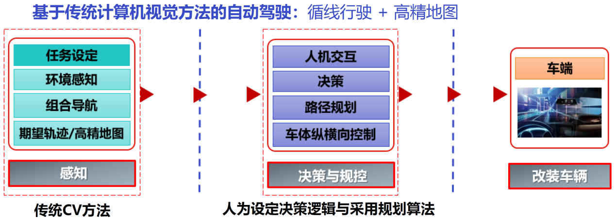 在感知部分,传统计算机视觉方法被广泛应用于环境感知和障碍物识别,主要依靠特征工程。在决策与规划部分,主要包括简单的决策和路径规划,特别强调车辆的纵向速度控制和横向偏差控制。这一阶段的自动驾驶系统依赖于人为设定的决策逻辑和基于规则的算法,因此被称为自动驾驶1.0阶段,如图1所示。