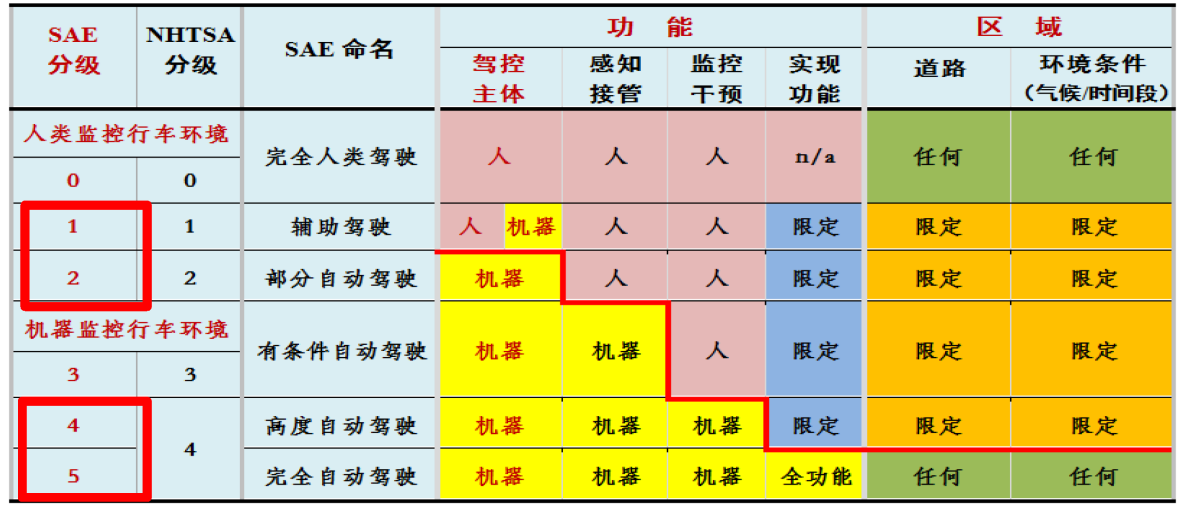 2021年,SAE和ISO进一步发布了新版的自动驾驶分级标准,如图2所示,其强调了自动驾驶技术在不同功能、区域和环境条件下的应用。这些标准帮助明确了各类自动驾驶系统的实际能力,尽管一些企业可能出于宣传目的将辅助驾驶系统称为自动驾驶系统。L0到L2级别被称为辅助驾驶,而只有L3到L5级别才被定义为自动驾驶。因此,当我们谈论自动驾驶时,指的是L3及以上级别,L2及以下都属于辅助驾驶。