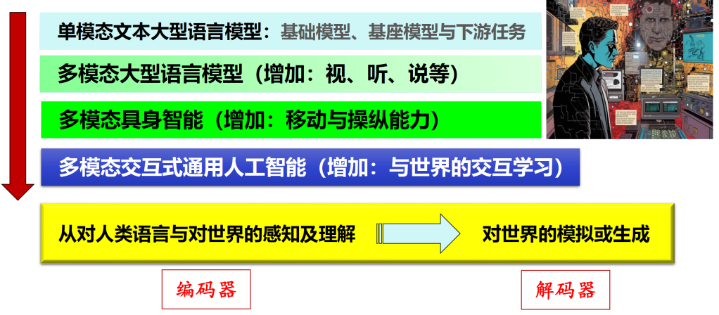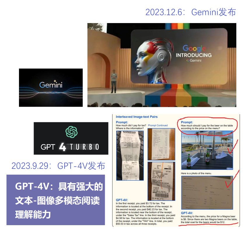单模态文本语言模型,如 GPT-4,展示了显著的改进和变革。例如,以前的机器学习或人工智能在处理文本时,仅仅能匹配和对齐,但不能真正理解文本内容。而现在的 GPT-4 能够很好地理解文本,例如复杂的小学数学应用题,能够分解问题和任务。其关键在于利用语言模型和世界知识的学习,将许多 token 之间的关系和属性进行聚合和连接,从而具备了理解和生成文本的能力。