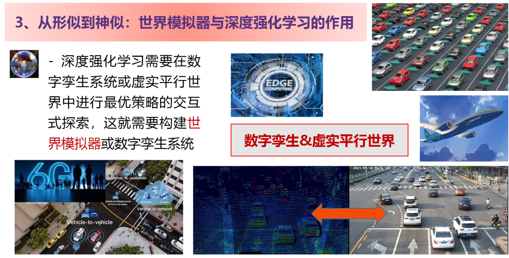 交互不仅涉及环境适应,还包括智能体的主动探索。通过在虚拟环境中进行训练,可以显著提高智能体的效率和安全性。这种方法避免了在真实世界中进行高风险试验,减少了实验成本,同时更高效地提升了智能体的性能。总的来说,未来的自动驾驶系统将依赖于多模态的视觉理解、强大的交互能力以及智能体的主动学习,以实现更智能和更安全的自动驾驶。在实现高级智能体时,虚拟世界的模拟和深度强化学习的结合显得尤为重要。传统的学习方式往往受限于物理世界中的高成本和低效率,而虚拟环境的应用可以极大地提升智能体的学习效率和能力。