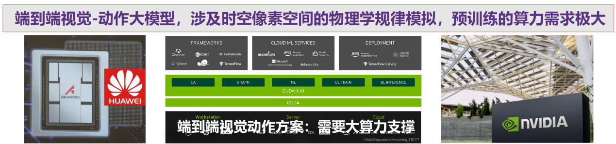 端到端的视频动作解决方案对数据的需求极其高,需要大量的短视频和动作数据来进行有效的训练。这种解决方案的实现依赖于极大的AI算力,特别是在联合预训练阶段。在这一阶段,通常需要百万量级的短视频数据。短视频因其信息量大且重复较少,适合用于大规模数据处理。预训练阶段是最为算力密集的,因为涉及到处理大量数据并建立初步模型。