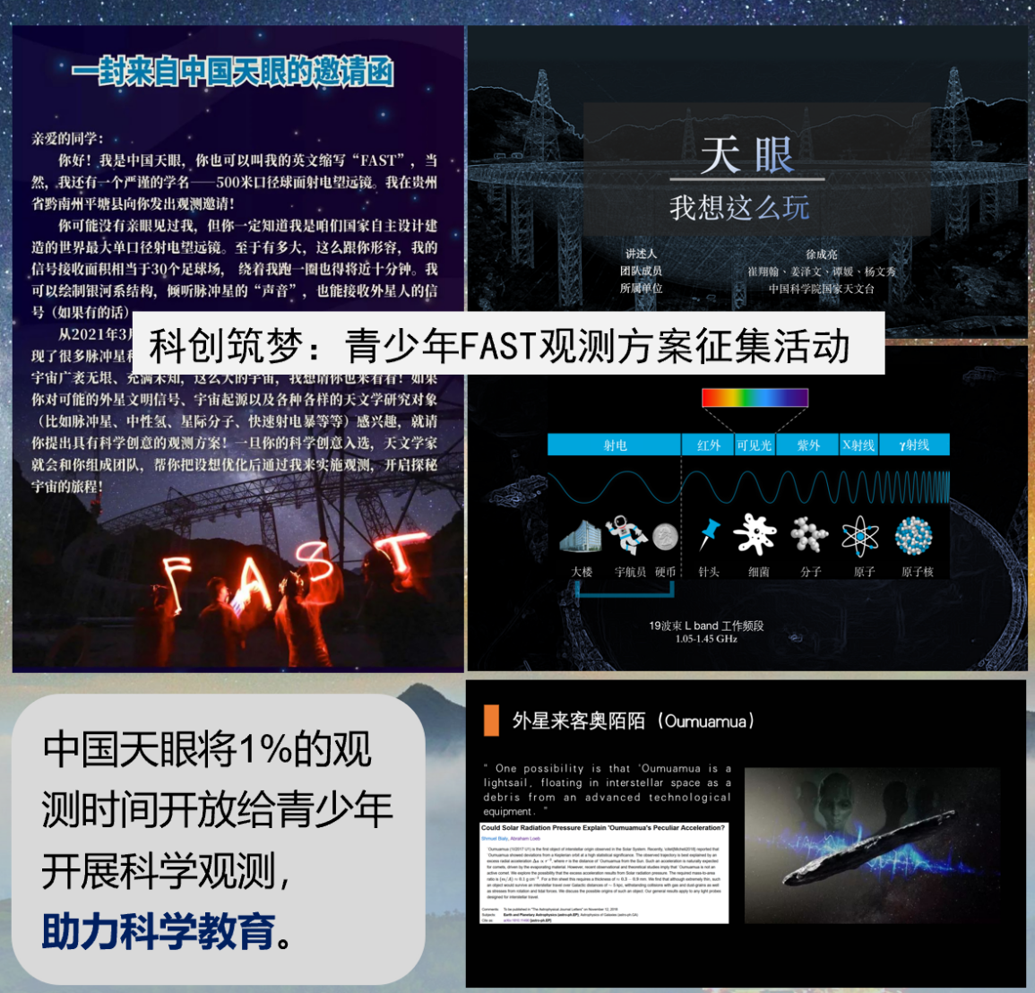 在中国科学技术协会和中国青少年科技工作者协会的指导下,我们曾利用世界最大的射电望远镜——中国“天眼”,将其1%的时间分配给青少年进行科学观测,如图1所示。通过这一实践活动,我们收到了3000多份观测报告,其中不乏一些优秀的观测方案,约300项被评为杰出。这一过程对于科学教育的推动作用显著,展示了前沿科研设备如何激发青少年的创新思维和科研兴趣。然而,由于中国“天眼”的稀缺性,这一资源远不能满足全国青少年对科学教育的需求。中国拥有25万所中小学,每年接纳上亿的学生,要让每个孩子,尤其是偏远地区和山区的孩子,都能接触到科学教育资源,仍然面临巨大的挑战。