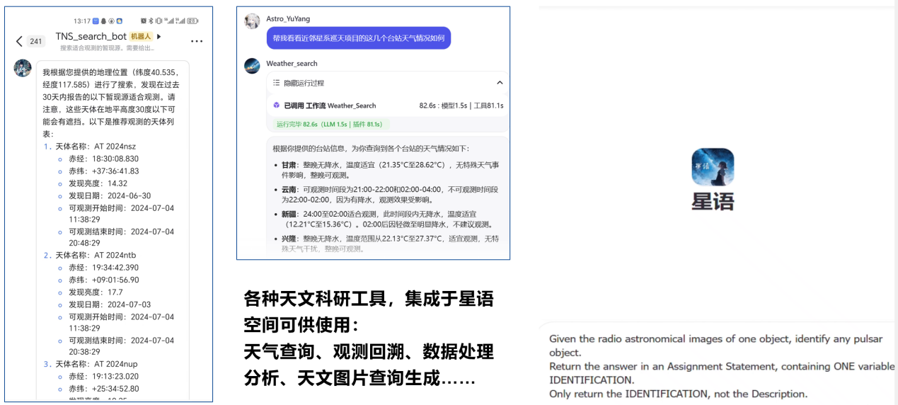 以往中小学生在从事科研时,通常需要联系大学教师或天文台专家来解答他们的问题并协助完成各种科研任务。而现在,借助于Star Whisper,学生们无需依赖这些传统途径就能开始自己的科研探索。Star Whisper的另一项创新功能是智能化的望远镜操作。许多学校配备了望远镜,但由于操作要求较为专业,通常很难要求每位教师都具备使用望远镜的能力。我们将Star Whisper作为基础平台,结合望远镜的智能化应用,使其能够通过自然语言交互完成一系列任务,包括检验观测条件、开机、定向、调焦以及初步数据处理。这使得望远镜的使用变得更加简单和智能,能够逐步向学生提供他们所需的科学数据。
