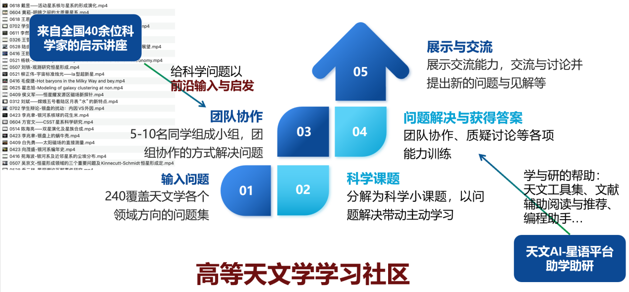 此外,平台的另一重要功能是学习社区的建设。以“高等天文学学习社区”为例,如图7所示,其推动了从单向的知识传输向双向互动的课堂转变。在这个过程中,学生与教师、专家之间形成了更加紧密的合作,学生能够参与到前沿科学问题的解答中。这种互动不仅帮助学生深化对科学问题的理解,还通过探索性的方式,培养学生独立思考和解决问题的能力。