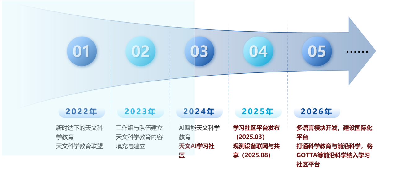 从2022年开始,如图8所示,天文科学教育联盟逐步建设,2023年成立了多个工作组,逐步完善科研教育内容。到2024年,Star Whisper和AstroOne两大AI模型已经投入使用,这两者通过持续对抗优化,共同促进了天文AI技术的发展,推动着教育平台的完善。到2025年,平台能够向更多学校开放,支持科研人员和学生的共同探索。而在2026年,我们计划建设国际化平台,向全球推广天文科学教育和科研资源。