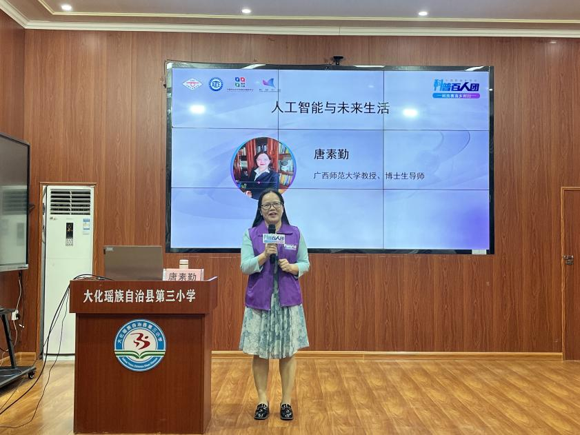 广西师范大学教授唐素勤以“人工智能与未来生活”为主题,探讨了人工智能在未来生活各个方面的应用和影响。她通过展示AI在医疗、交通、教育、娱乐等领域的创新成果和发展趋势,让同学们看到人工智能将如何改变我们的生活方式,启发同学们思考如何更好地利用人工智能创造美好的未来。